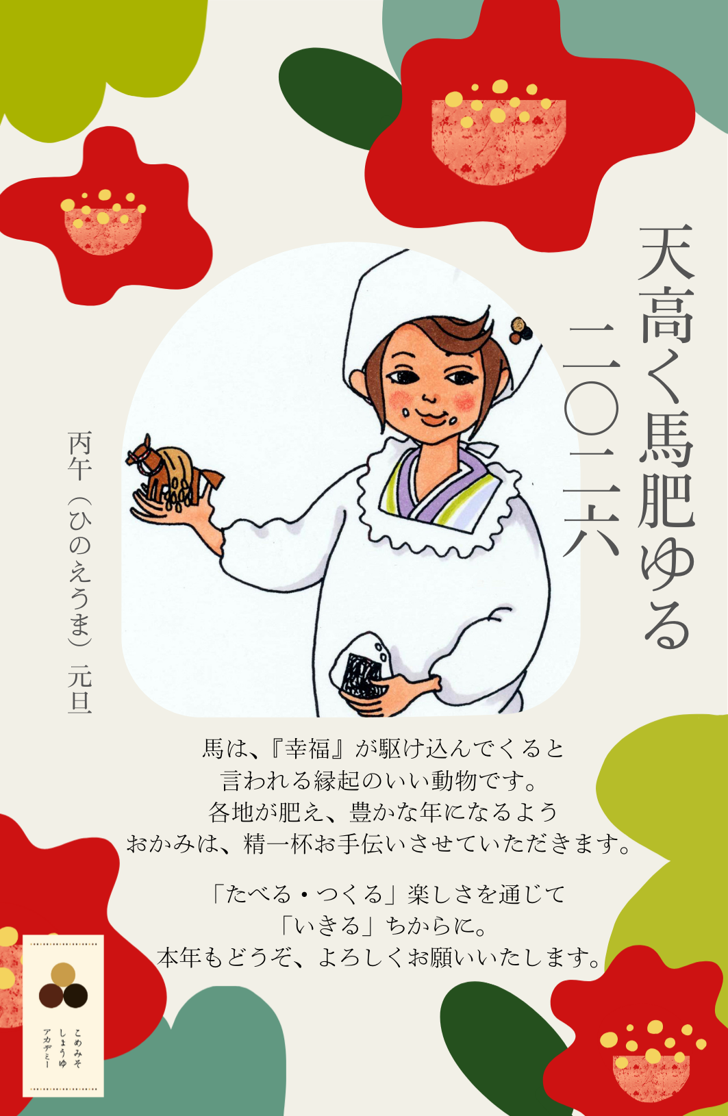あけましておめでとうございます。 馬は「幸福」が駆け込んでくると言われる縁起のいい動物です。各地が肥え、豊かな年になるようおかみは精一杯お手伝いさせていただきます。 「たべる・つくる」楽しさを通じて「いきる」ちからに。本年もどうぞ、よろしくお願いいたします。 2026年 丙午(ひのえうま)元旦